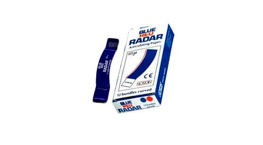 pkt of 12 BUNDLES BLUE RED RADAR ARTICULATING PAPER 65 MICRONS Radar Articulating Paper Extra sensitive articulating paper for correct bite control. Blue/Red Radar Blue and red on the same paper for rapid double checking. Anatomically shaped, horseshoe or curved with uncoloured thumb-grip. Blue/Blue Radar Both sides coloured blue. The rest the same as Blue/Red Radar. Made in Swiss